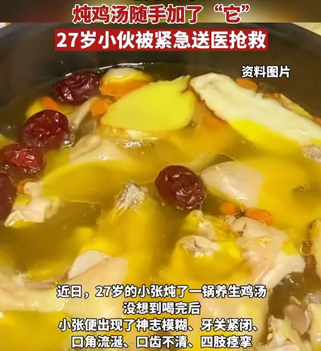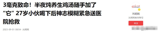 光明网 《3毫克致命!半夜炖养生鸡汤随手加了“它” 27岁小伙喝下后神志模糊紧急送医院抢救》2023-09-01