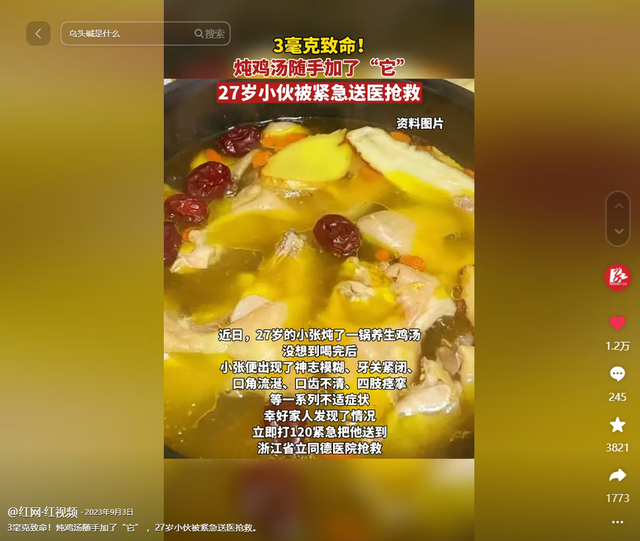 抖音@红网·红视频《3毫克致命!炖鸡汤随手加了“它”,27岁小伙被紧急送医抢救》2023-09-03